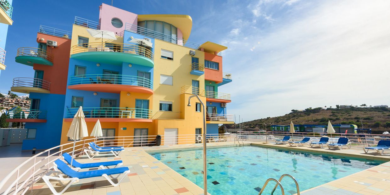 Outdoor areas include a spacious terrace and two balconies, perfect for enjoying the Algarve sunshine while overlooking the marina and swimming pool.